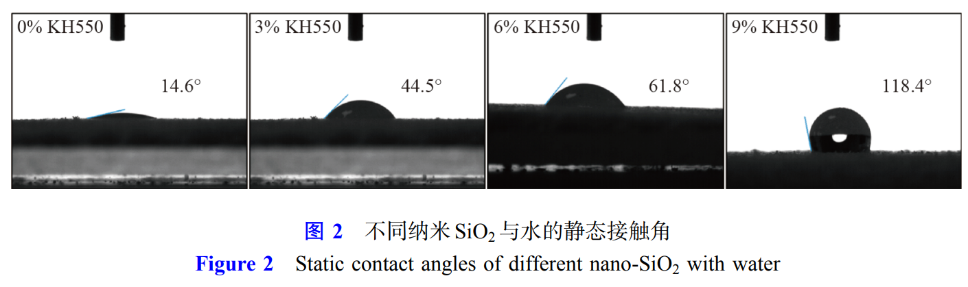 The surface wetting property of nanoparticles is the key to forming stable Pickering emulsions. Figure 2 shows the static contact angles of different nano-SiO2 with water. The contact angle of unmodified SiO2 is 14.6°, and the particles can be almost completely wetted by the aqueous phase. As the amount of KH550 increases, the particle contact angle gradually increases. When the amount of KH550 is 6%, the contact angle between SiO2 and water is 61.8°, indicating that some -OH groups on the surface of SiO2 combine with -OH produced by the hydrolysis of KH550 to form Si-O-Si bonds, reducing the hydrophilicity of SiO2. When the amount of KH550 increases to 9%, the contact angle of the modified nano-SiO2 increases to 118.4°, indicating a transition from hydrophilicity to slightly hydrophobicity.