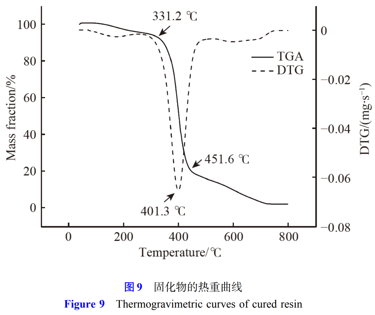 The thermogravimetric analysis results demonstrate that the cured product exhibits good temperature resistance and thermal stability.