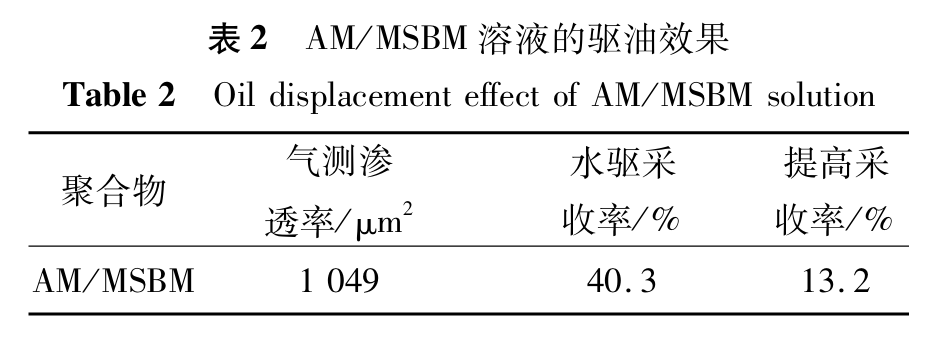 表2为AM/MSBM溶液的驱油效果。由表2可见,使用AM/MSBM溶液驱油,可提高采收率13.2%。