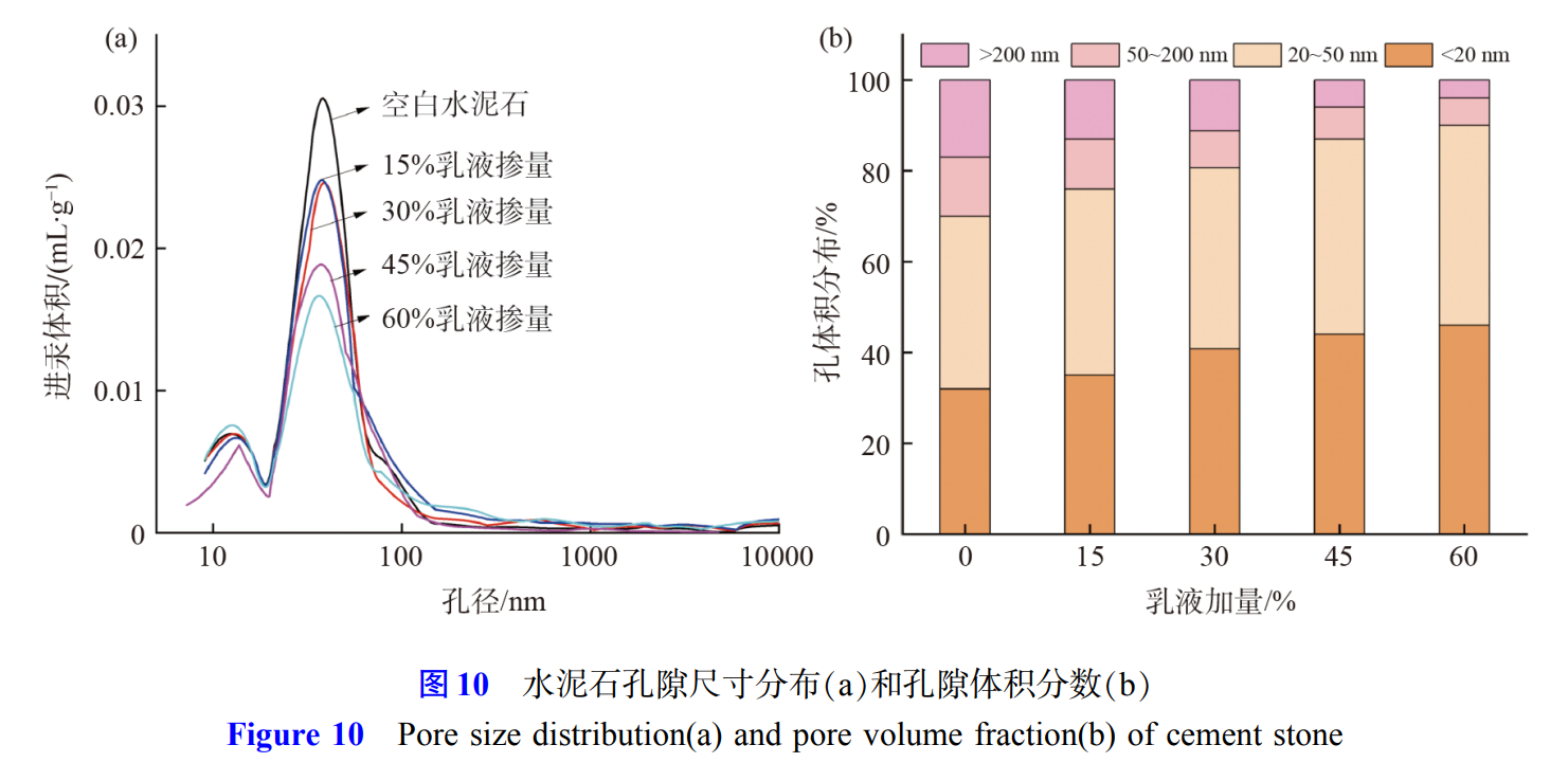 (3)复合乳液实现了环氧树脂良好的分散效果,环氧树脂均匀分布于水泥石中并固化形成致密的三维网状结构,增强了水泥石强度和形变性能;乳液中的改性纳米 SiO 2 通过火山灰反应与水泥基体结合,从而有效地提升了树脂相与水泥基体的界面结合,优化了孔隙结构。复合乳液实现了有机-无机材料协同增强水泥石力学强度和形变性能,保证了水泥环密封完整性。