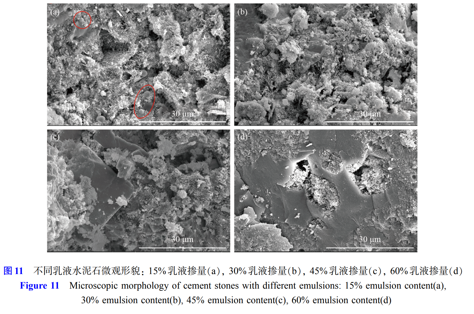 图11(a~d)分别显示了 15%、30%、45%和60%复合乳液加量下水泥石断面微观形貌。可以看出,在较少乳液加量(15%)下,固化后的环氧树脂以球状颗粒形态均匀分布在水泥基体中,表明环氧树脂在水泥浆内实现了良好的分散效果,并且树脂与水泥水化产物界面结合较为紧密。30% 乳液掺量水泥石断面除了球状环氧树脂外,还出现了部分膜状物,环氧树脂加量的提升使其在固化过程中能够部分交联成片,从而同时出现球状和膜状环氧树脂。随着乳液加量进一步提升,环氧树脂的交联愈发密集,水泥石断面出现了大片连续的膜状物,水泥石结构变得更为致密,表现为水泥石孔隙度的降低。