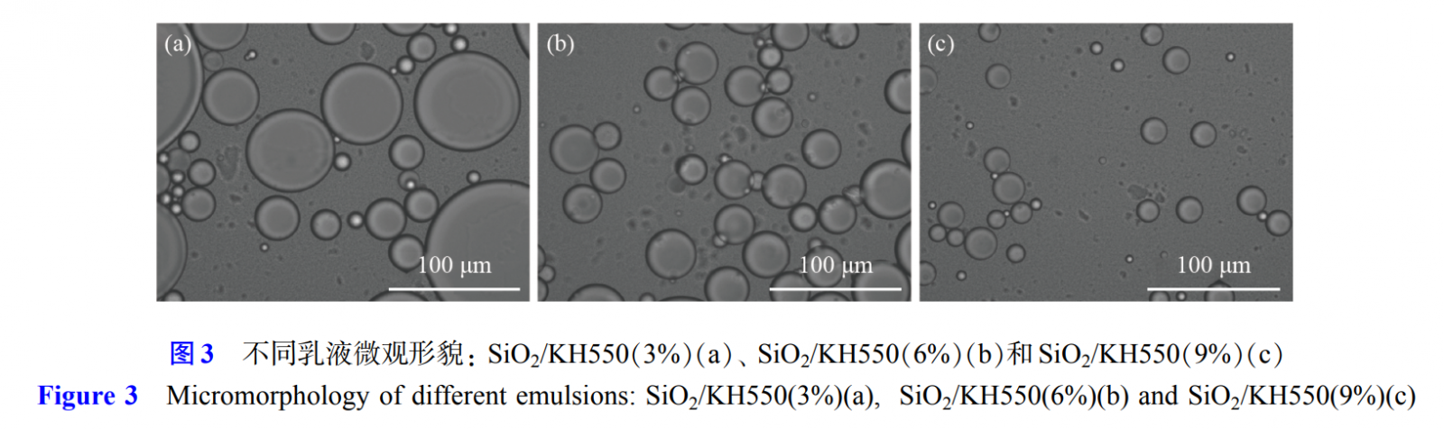 图 3(a~c)分别显示了SiO 2/KH550(3%)、SiO2/KH550(6%)和 SiO2 /KH550(9%)样品所制备乳液微观形貌。由于未改性纳米SiO2较高的亲水性导致其无法吸附在油水界面上,无法形成稳定乳液。SiO2 /KH550(3%)制备的乳液液滴较大且不均匀,液滴间聚集明显,这是由于纳米颗粒仍具备较高的亲水性,大量SiO 2分散在水中而不是油/水界面上,造成树脂聚集。随着KH550用量的增加, 纳米SiO2的乳化能力得到提高,SiO2 /KH550(6%)和 SiO2 /KH550(9%)能够有效稳定乳液,乳液液滴较小,粒径相对均一。综合来看,为了形成稳定的乳液,同时考虑到疏水SiO 2会导致所制备乳液与水泥浆相容性较差,KH550的最佳用量确定为6%。