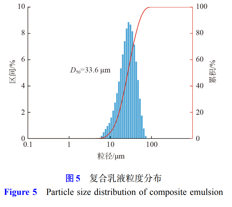 图5为复合乳液的粒度分布,可以看出,乳液液滴粒径分布较窄,中值粒径为33.6μm。通常来说,环氧树脂自身较高的黏度导致其不易乳化成细小液滴,而复合乳液液滴粒径能保持在较小的粒度,有利于环氧树脂在水泥浆中形成更好的分散。