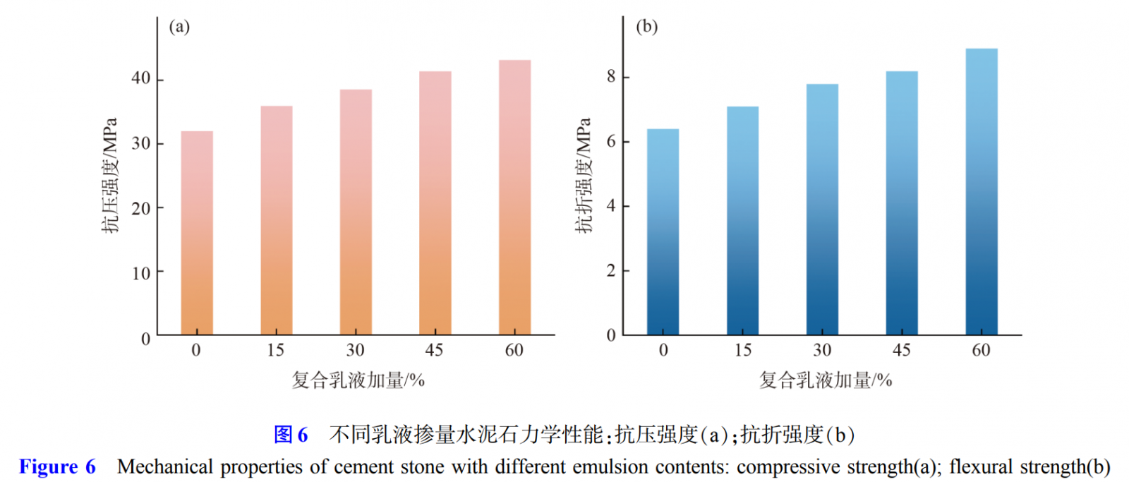 所制备乳液作为有机-无机复合乳液,能够从两个方面改善水泥石力学性能:首先,复合乳液良好的稳定性实现了环氧树脂在水泥浆内良好的分散效果,避免了油性环氧树脂在水泥浆中不易分散的问题。树脂良好的分散有助于水泥石承受荷 载时内部应力分布更为均匀,环氧树脂也能够发 挥自身力学特性,承载和缓冲更多能量,达到增强水泥石力学强度和形变性能的效果[16] 。另外,乳液中的纳米 SiO 2一端与树脂连接,分散到水泥浆后能通过火山灰反应与水泥基体结合,在提升水泥石力学性能的同时还能有效地增强树脂相与水 泥基体的界面结合,优化了水泥石孔隙度,进一步增强了水泥石内部裂纹拓展过程中的应力消散。复合乳液有助于协同发挥有机材料和无机材料的性能优势,实现了环氧树脂在水泥浆中良好的分散和紧密的界面结合,以增强油井水泥的力学性能,尤其是显著改善了水泥石在荷载下的形变能力,保证了水泥环在复杂应力下的密封完整性,最终达到了提升固井质量的目的。