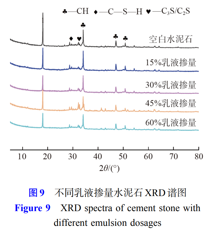 图9为不同乳液掺量水泥石XRD谱图,可以看出乳液水泥石物相组成与空白水泥石一致,以CH和C—S—H 为主,这表明环氧树脂乳液的掺入并不会影响水泥水化物相组成。和空白水泥石相比,乳液水泥石CH衍射峰强度出现下降趋势,并且乳液含量越多,下降越明显,这可能是由于复合乳液中大量的纳米SiO 2与CH 反应生成大量为水泥石提供强度的C—S—H凝胶,从而在减少水化产物中CH的同时进一步增强水泥石力学强度。