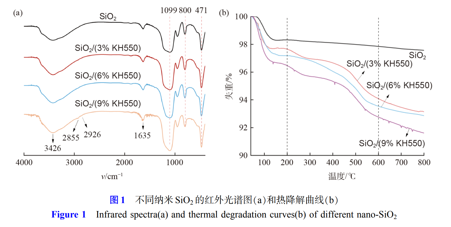 Figure1(a) shows the infrared spectra of different nano-SiO2. The four types of SiO2 all have distinct characteristic absorption peaks at 471cm–1, 800cm–1, and 1099cm–1, representing the bending and stretching vibrations of Si—O—Si. The absorption peaks at 3426cm–1 and 1635cm–1 are attributed to the asymmetric H—O vibration and the bending vibration of H—O—H, respectively. The modified SiO2 shows weak new absorption peaks at 2855cm–1 and 2926cm–1, which is due to the introduction of—CH2 and—CH3 by KH550. Additionally, the hydroxyl characteristic peak at 3426cm–1 decreases with the increase in the amount of KH550, indicating a reduction in the number of hydroxyl groups on the SiO2 surface. The absorption peaks of—NH2 and—OH overlap, resulting in a slightly wider peak shape at 3300-3400cm–1. As shown in Figure 1(b), the thermal degradation curves of the four types of SiO2 are presented. The weight loss of the unmodified nano-SiO2 mainly occurs within 200℃, and is mainly due to the decomposition of hydroxyl and free water. For the modified nano-SiO2, the weight loss can be divided into two stages: within 200 ℃, the weight loss is mainly caused by water evaporation, and above 200 ℃, the weight loss is related to the decomposition of the organic chain of KH550. The weight loss of the SiO2/KH550 (3%), SiO2/KH550 (6%), and SiO2/KH550 (9%) samples at 200-600 ℃ is 3.5%, 3.6%, and 3.7%, respectively. The weight loss of the samples within this temperature range increases with the increase in the amount of KH550, indicating that different amounts of KH550 have successfully grafted onto the surface of nano-SiO2, thereby forming different thermal degradation trends.