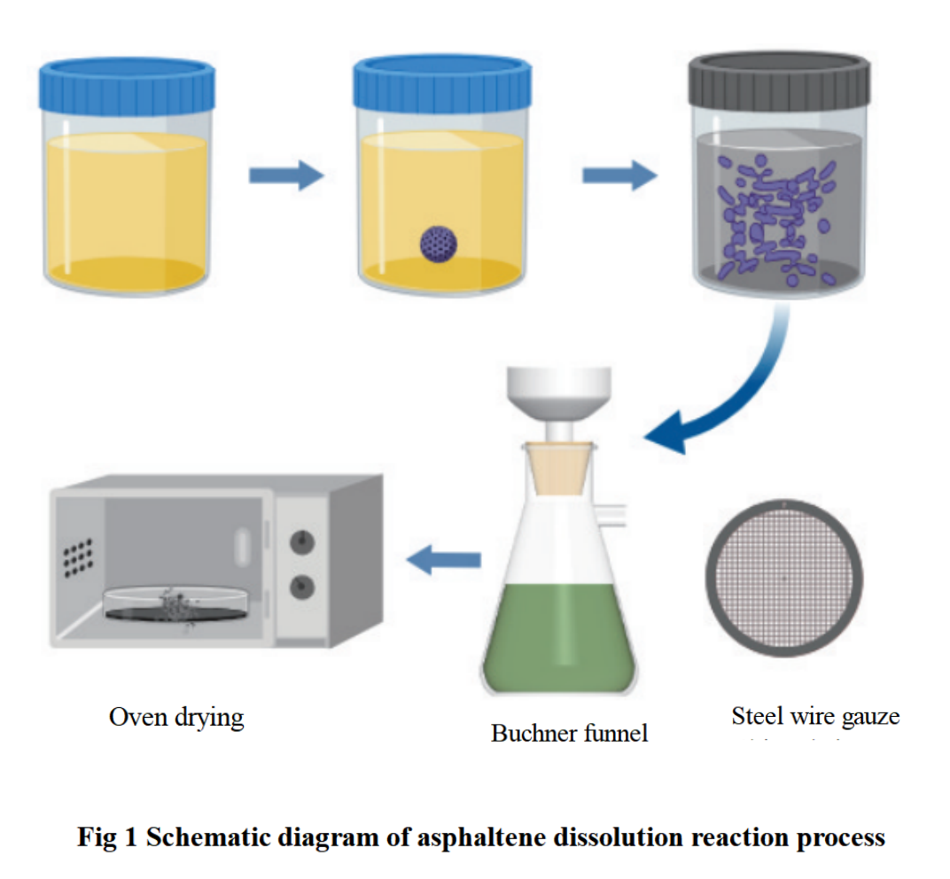 At present, there is no established evaluation standard for asphalt dispersants in China. In order to meet the requirements of rapid evaluation of the performance of asphalt dispersants on oilfield sites, this article constructs a new method for efficiently and accurately determining the solubility rate of asphalt dispersants.The specific operation is as follows: Make 1 g small balls of Ha Yi Lian asphalt sediment, add 5 g of dispersant, and dissolve them in a 30℃ constant temperature test chamber for 120 minutes; Filter the 120 mesh steel wire mesh, clean the remaining sediment at the bottom of the bottle with anhydrous ethanol, and dry it in a 50℃ oven for 6 hours. Weigh and record the remaining insoluble matter mass. The ratio of the dissolved sediment mass to the initial sediment mass is the dissolution rate of the sediment.The dissolution reaction process is shown in Figure 1. Using the difference method to compare the states of various dispersants before and after treatment of asphalt deposits, and selecting the dispersant with good dissolution effect.