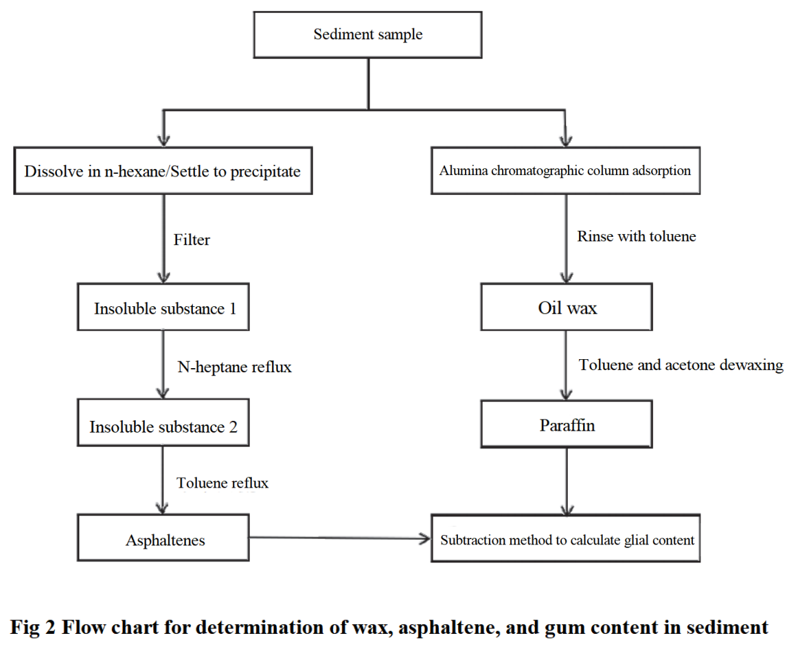 The separation of asphaltene sediment refers to SY/T 7550-2004 "Determination of wax, gum, and asphaltene content in crude oil".Dissolve a sediment sample in n-heptane, filter out the insoluble material, reflux with n-heptane to remove paraffin and gum from the insoluble material, then extract the asphaltene with toluene and dissolve it again to calculate the asphaltene content.In addition, one sample was subjected to alumina column chromatography to remove resin, and then mixed with toluene acetone (1:1) for dewaxing treatment. The wax component in the sample was determined by freezing crystallization method. Use the difference method to analyze the sample and determine the gum content in the sample. The measurement process is shown in Figure 2.