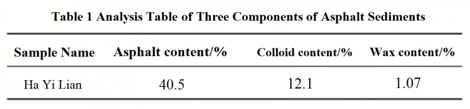 The sediment in the Ha Yi Lian Formation contains 40.5% asphaltene, 12.1% resin, and 1.07% paraffin, with asphaltene being the main component.