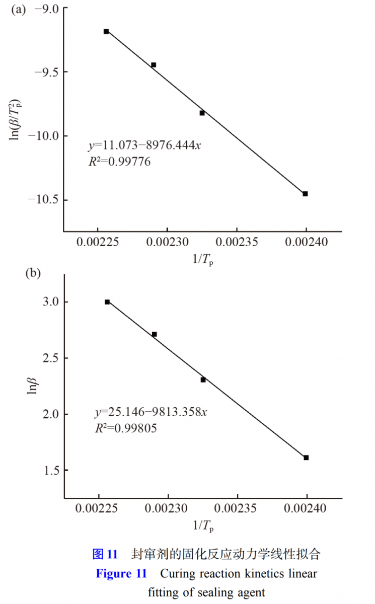 Figure 10 shows the DSC curves of the cured epoxy resin plugging agent ZFA-10. The reaction kinetics parameters were obtained by processing the DSC data at different heating rates using the KISSINGER equation and the CRANE equation.