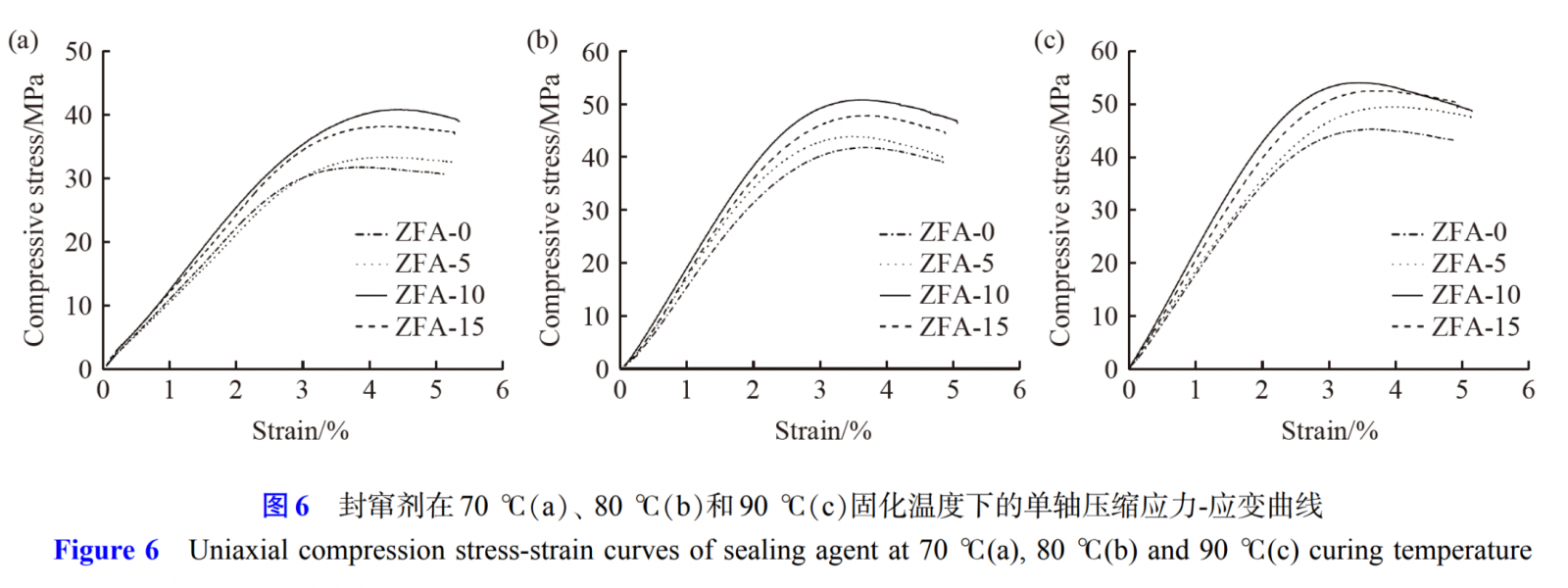 Figure 6 presents uniaxial compression stress-strain curves of resin sealing agents at different curing temperatures. As shown in Figures 6(a-c), all samples exhibit a consistent trend: at identical curing temperatures, the peak strength of HERJ samples consistently exceeds that of ZFA-0 (HERJ 0% content), with ZFA-10 (HERJ 10% content) demonstrating the highest peak strength. ZFA-10 achieves peak strengths of 40.7 MPa at 70°C, 50.6 MPa at 80°C, and 53.9 MPa at 90°C – representing a 19.50% increase compared to the baseline ZFA-0 sample. Integration analysis of the 90°C curves reveals a 13.58% larger integral area for ZFA-10 than ZFA-0, indicating significant improvement in curing toughness. This enhancement stems from the abundant functional groups at the superbranched resin terminals, which actively participate in epoxy curing reactions and form homogeneous phases with the matrix, thereby strengthening crosslinking. Additionally, the intramolecular cavity structures in superbranched resins increase free volume near crosslinking points during curing. When subjected to impact forces, these cavities deform to absorb energy, effectively enhancing the epoxy curing material's toughness.